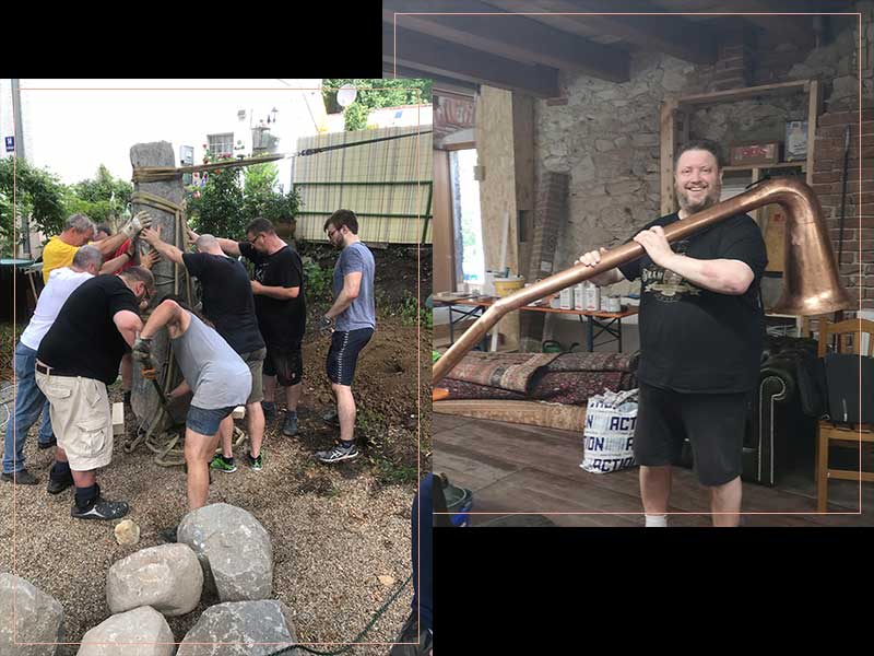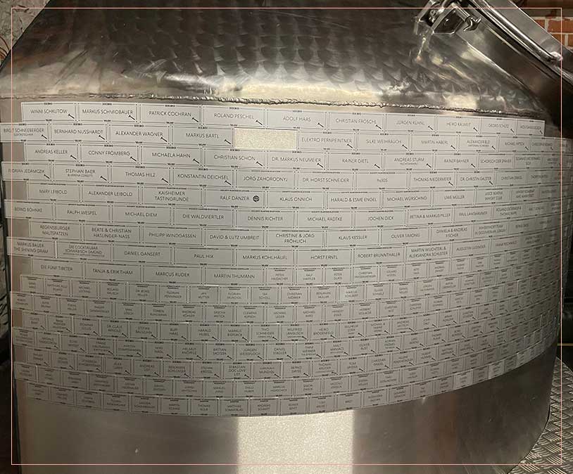 Ein solches Riesenprojekt kann nur von vielen Schultern getragen werden. Neben Pit haben sich eine Vielzahl an Helfern und Handwerkern seines Netzwerks (‚Heroes‘) über Jahre beim Bau verdient gemacht. Hinzu kommt die unglaubliche Großzügigkeit der vielen ‚Founder‘, die das Museum finanziell unterstützt haben. All diese Helfer sind auf unserer ‚Lauter Tun‘ (Läuterbottich, bzw. nun eine ‚Leutebottich‘) verewigt.